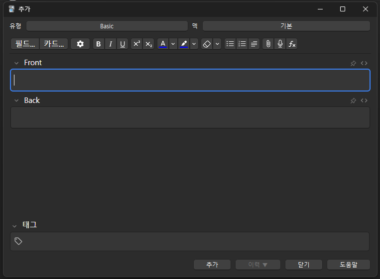 - Front, Back : 현재 Basic 유형은 앞면에 넣을 단어와 뒷면에 넣을 단어를 설정할 수 있다.
