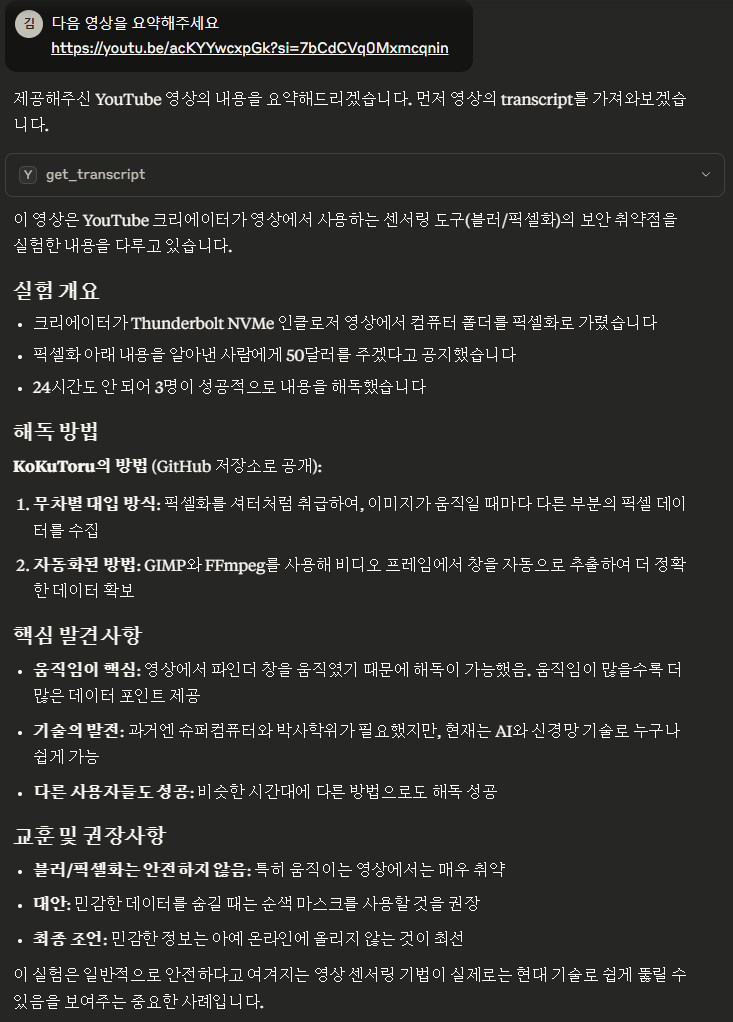 설정이 완료되면 Claude Desktop에서 바로 위 짤처럼 유튜브 영상을 분석할 수 있다